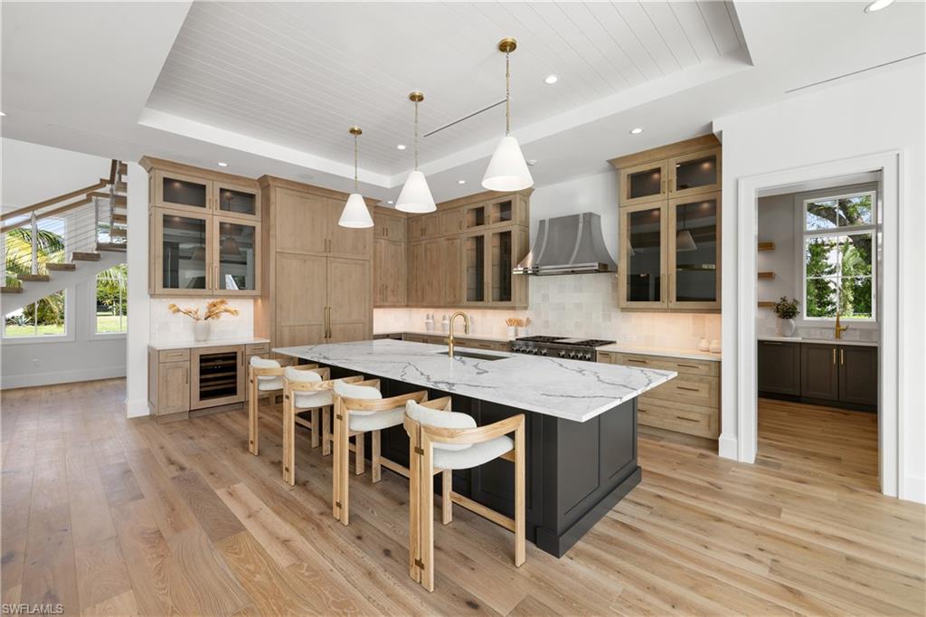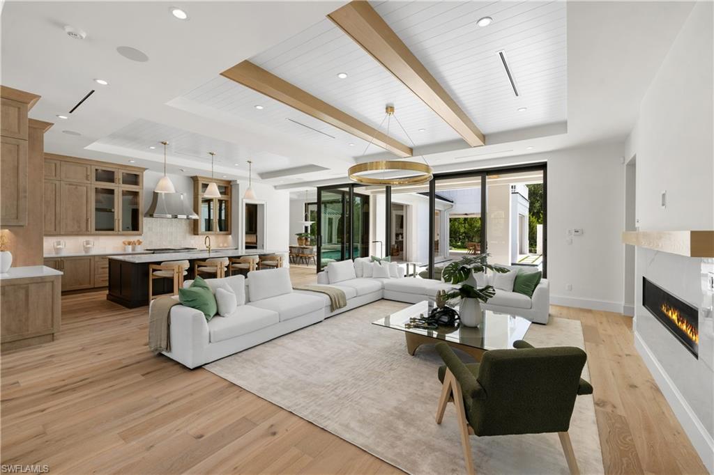 Newly constructed, never lived in and move-in ready, ideally situated on an oversized premium corner lot, this luxurious new-construction residence embodies the spirit of Naples living. Designed by MHK in collaboration with Waterside Builders and Diana Horsley Interiors, the spectacular light-filled six-bedroom + den home flows gracefully from one engaging space to another. Finished to the highest standard, the open floor plan with voluminous ceilings features multiple fireplaces, European oak floors, Ruben Sorhegui tile, quartz counters, elevator, and generator. Chef’s kitchen offers Subzero, Wolf and Miele appliances, large center island and generous butler’s pantry with additional storage and appliances. A full wall of pocketing glass sliding doors leads to spacious outdoor covered living areas, including an outdoor lounge, dining area, summer kitchen, half bath, and heated pool and spa with western exposure. First-floor primary retreat includes substantial dual walk-in closets and a spa-like ensuite bath with separate water closets. Bonus room, wet bar, balcony, laundry and five additional en-suite bedrooms, including a cabana/VIP suite with private entry, provide comfortable accommodations for guests on the second level. In close proximity to 5th Avenue S, Third Street S and sugar sand beaches, this home represents a rare opportunity to enjoy the best Naples has to offer.