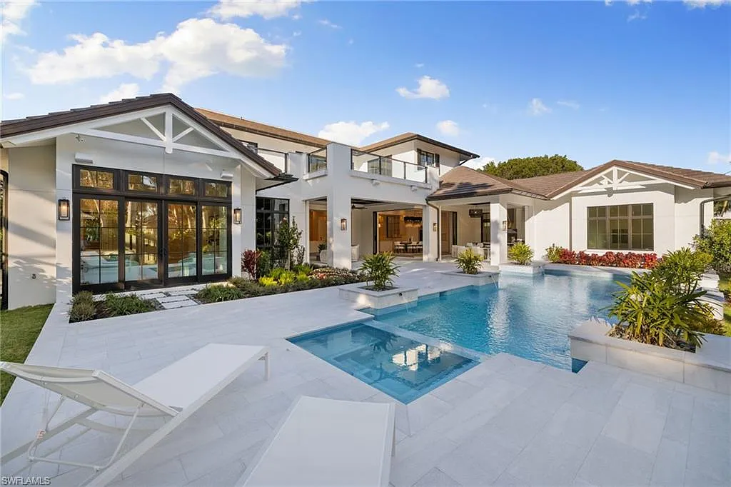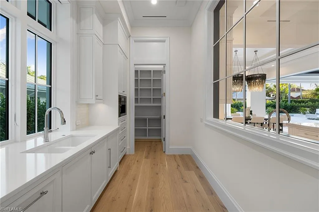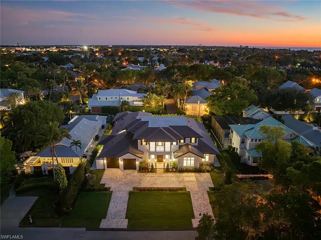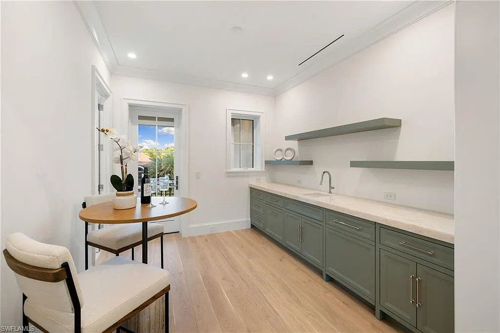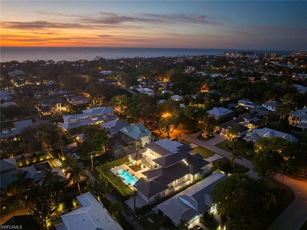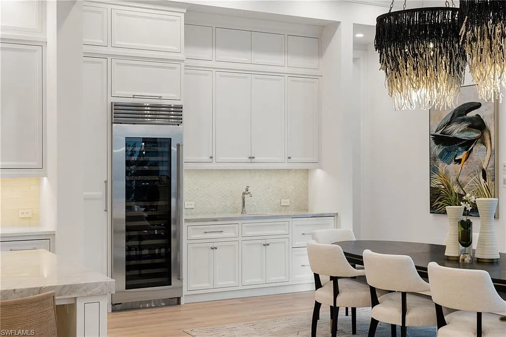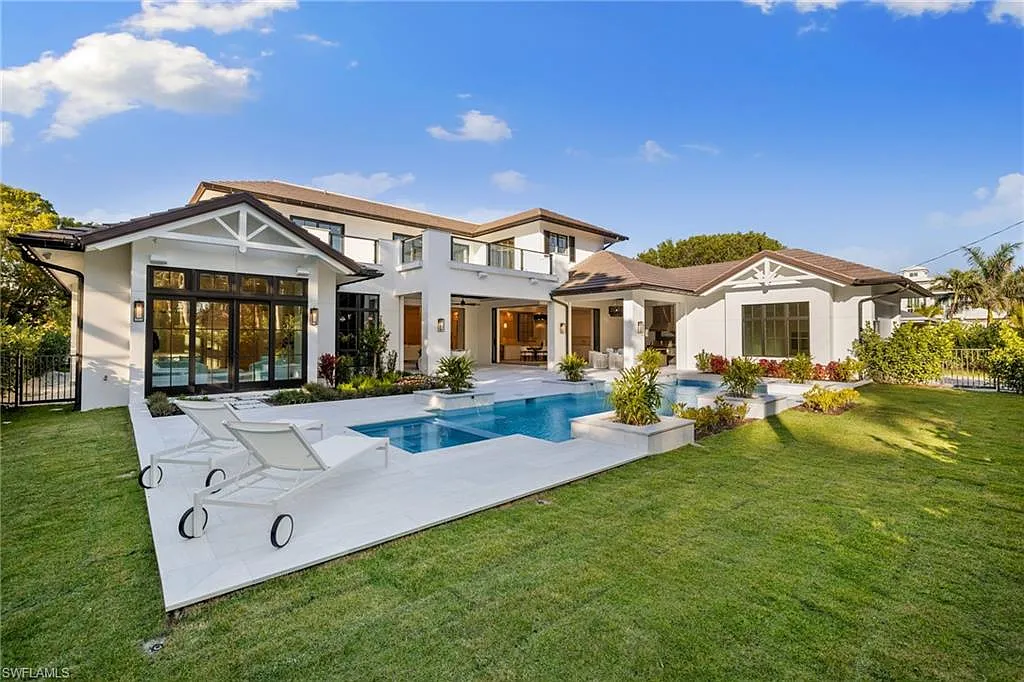 Situated on one of the most prestigious streets in Naples, just moments from its world-renowned sugar sand beaches, this exceptional new construction residence is set on an oversized homesite in the highly desirable X and X500 flood zones allowing for seamless 1st floor living. The home offers five ensuite bedrooms, including a ground-level owner’s suite with a spacious dressing room, study, and a flex room that offers a versatile space, perfect for a home gym, second closet, den or art studio. At the heart of the home is a magnificent great room, where timeless sophistication meets modern innovation. The residence includes a formal dining room, a state-of-the-art kitchen, and the latest in home automation, security, and built-in audio with speakers. The chef’s kitchen features high-end appliances from SubZero, Miele, and Wolf, dual wall ovens, beverage drawers, and a quartzite-topped island.