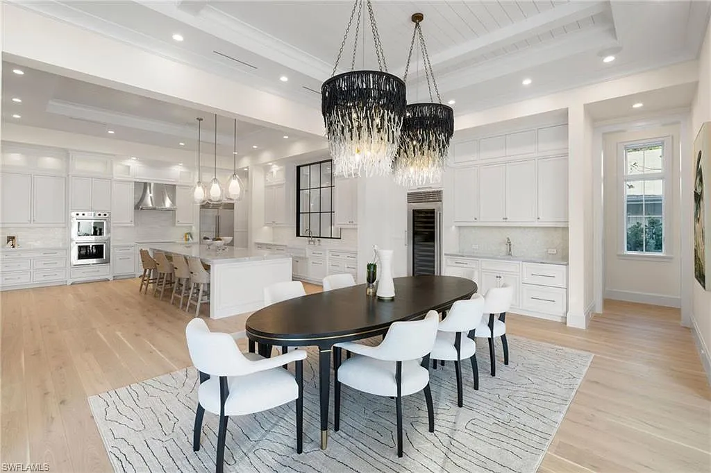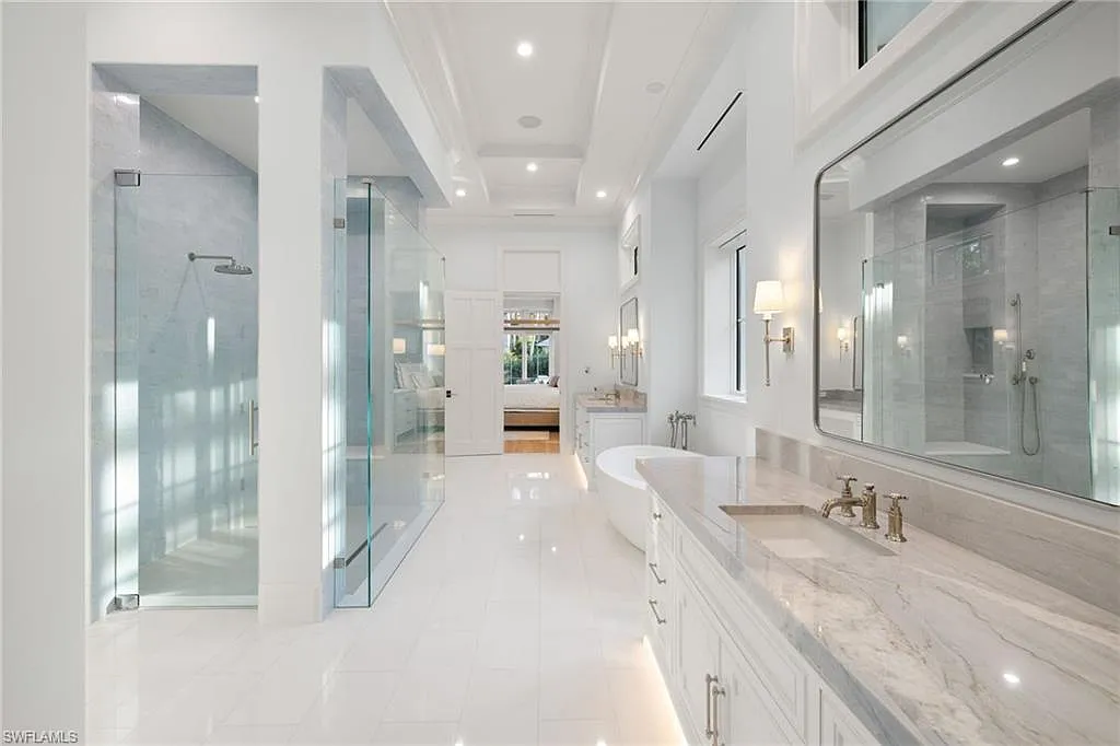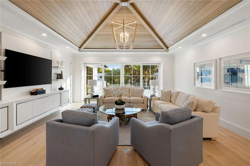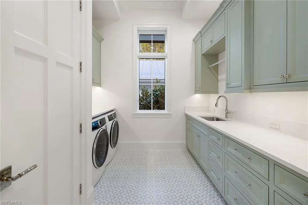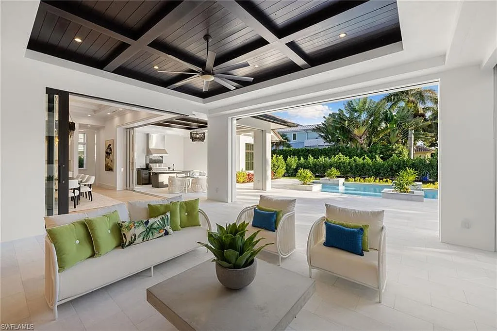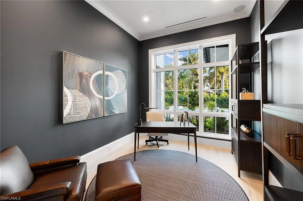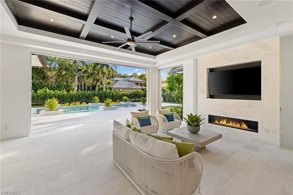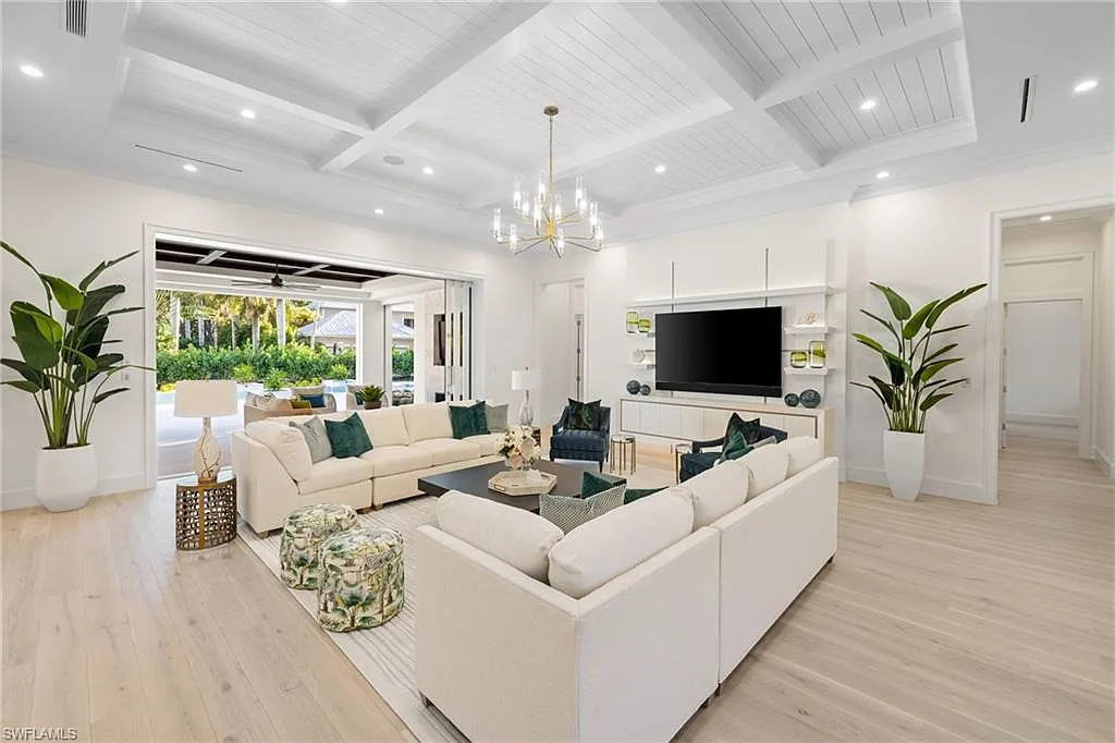 Situated on one of the most prestigious streets in Naples, just moments from its world-renowned sugar sand beaches, this exceptional new construction residence is set on an oversized homesite in the highly desirable X and X500 flood zones allowing for seamless 1st floor living. The home offers five ensuite bedrooms, including a ground-level owner’s suite with a spacious dressing room, study, and a flex room that offers a versatile space, perfect for a home gym, second closet, den or art studio. At the heart of the home is a magnificent great room, where timeless sophistication meets modern innovation. The residence includes a formal dining room, a state-of-the-art kitchen, and the latest in home automation, security, and built-in audio with speakers. The chef’s kitchen features high-end appliances from SubZero, Miele, and Wolf, dual wall ovens, beverage drawers, and a quartzite-topped island.