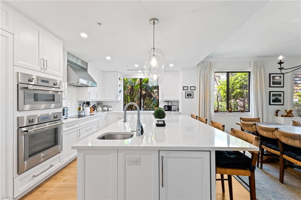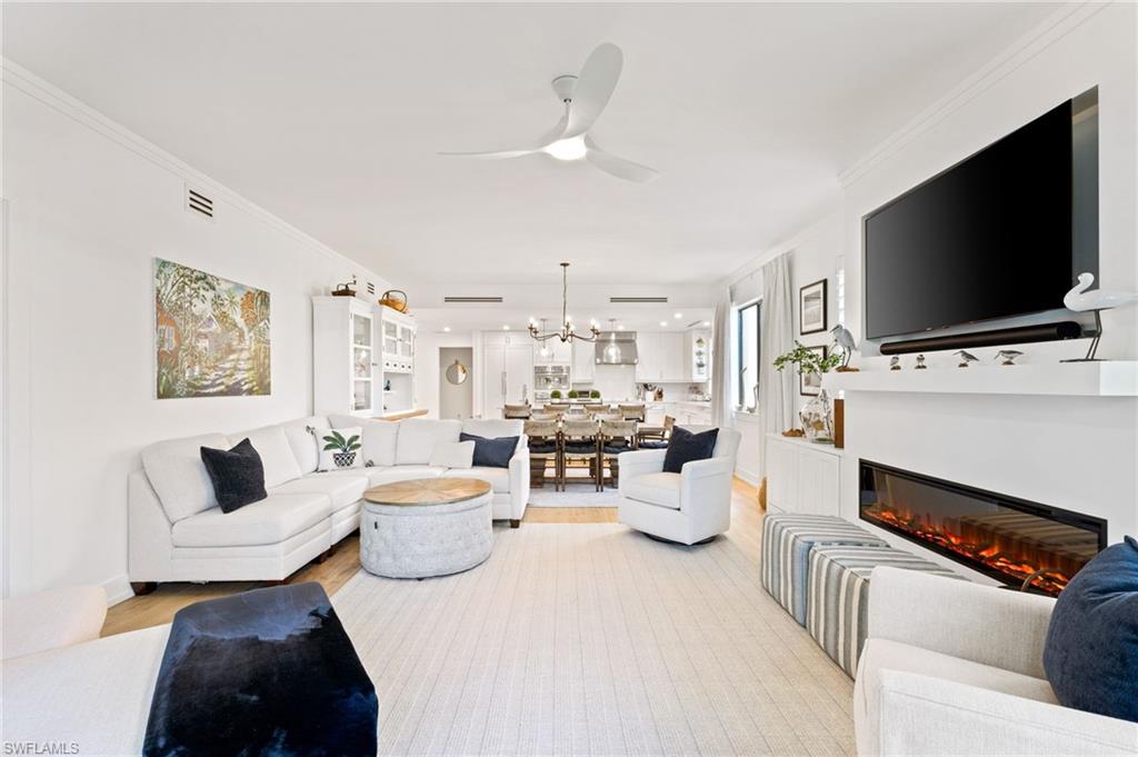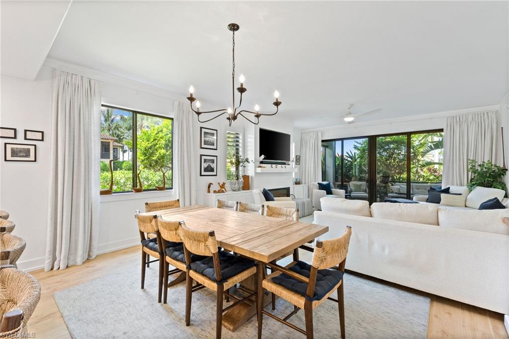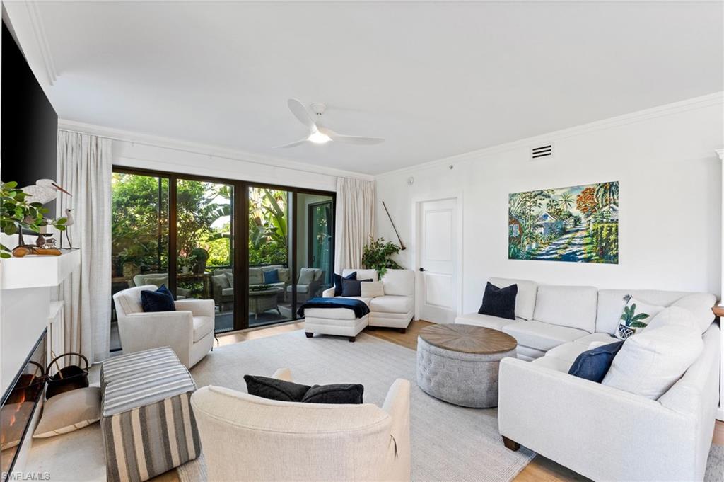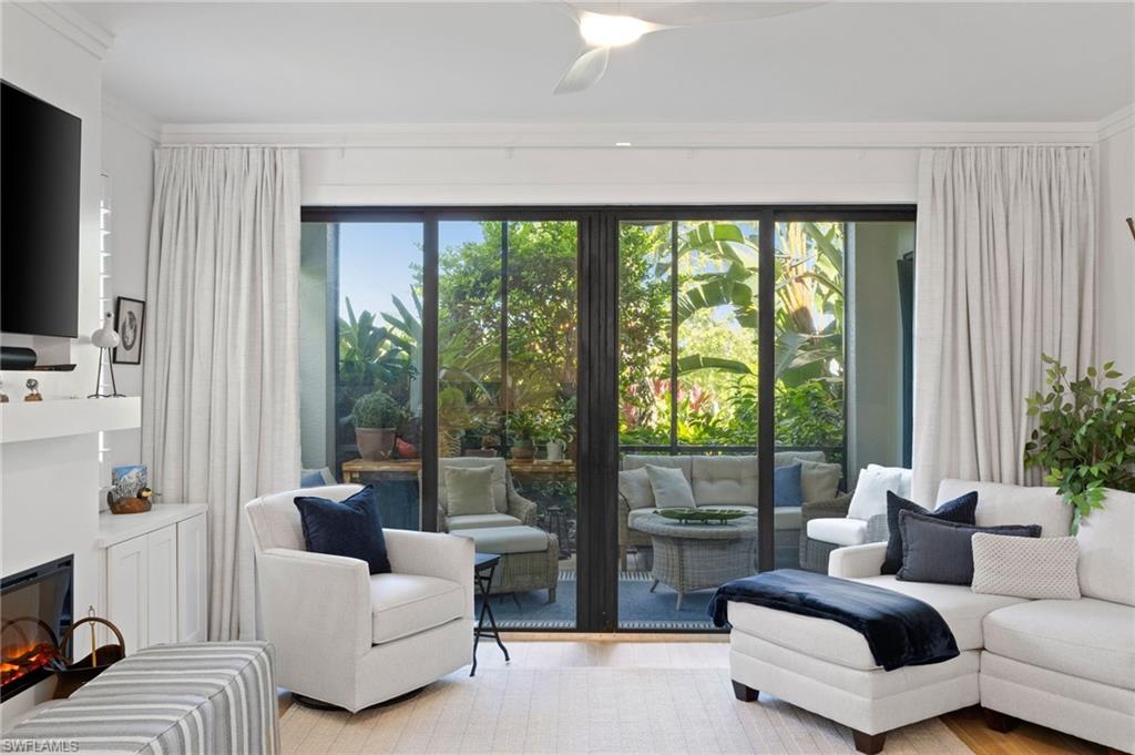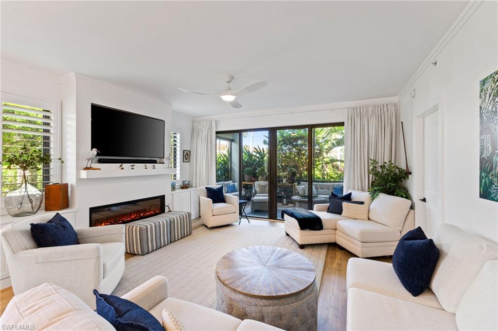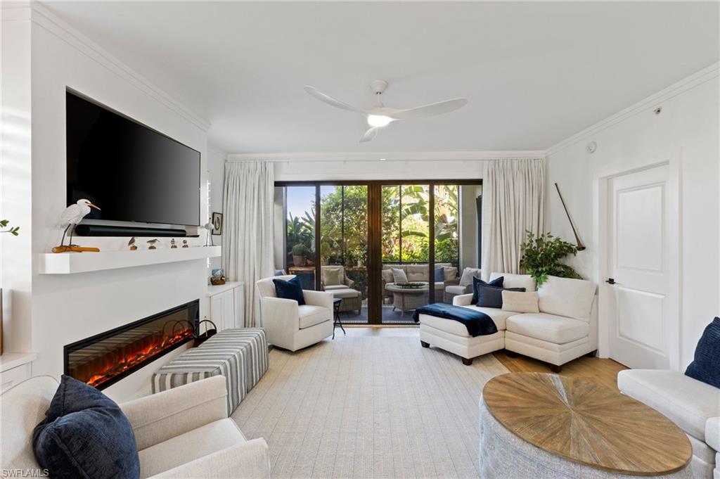 Elegantly appointed and fully renovated first-floor residence at The Cottages at Naples Bay Resort is now available. A corner unit ideally located on the ground floor. Masterfully reimagined, one of only eight true 3 bedroom condominiums in the community, the unit features a reconfigured kitchen with custom cabinetry, sleek counters, stylish fixtures, Thermador appliances, and a spacious center island with a prep sink and beverage refrigerator. Authentic wood featured porcelain tile flooring, crown molding, custom cabinetry, and a built-in fireplace complete the spacious living room. An oversized primary suite features two walk-in closets and an ensuite bath with a dual vanity, separate soaking tub and steam shower. Not to be outdone, the guest bathroom has also been completely upgraded. Motorized shades, plantation shutters, and custom drapery allow for bright southern sunlight during the day and privacy at night. Updated light fixtures, a tankless water heater, complete HVAC system, washer/dryer, and fan provide long-term comfort and convenience.
