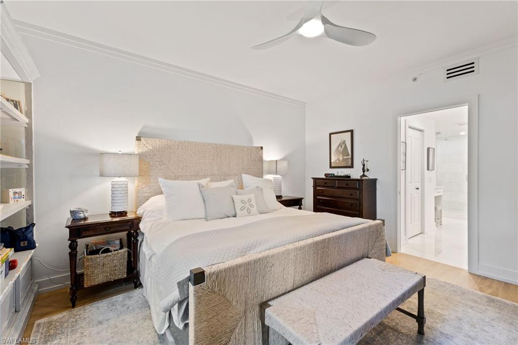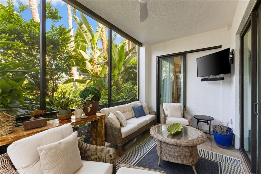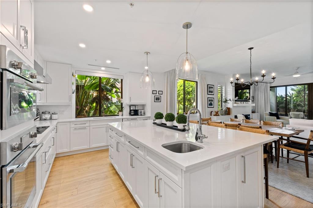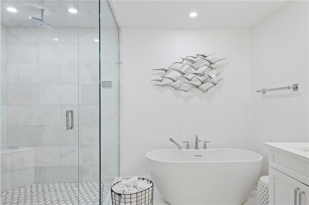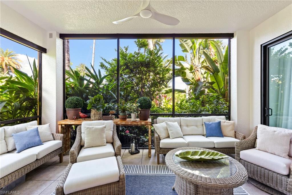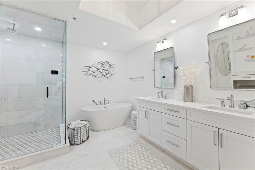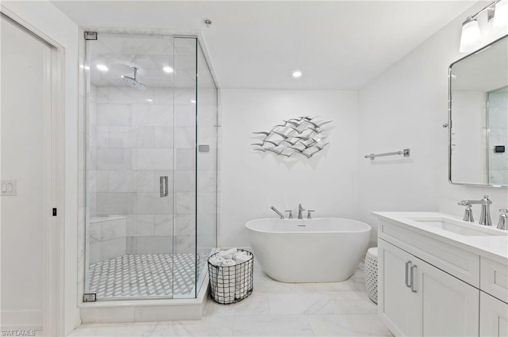 Elegantly appointed and fully renovated first-floor residence at The Cottages at Naples Bay Resort is now available. A corner unit ideally located on the ground floor. Masterfully reimagined, one of only eight true 3 bedroom condominiums in the community, the unit features a reconfigured kitchen with custom cabinetry, sleek counters, stylish fixtures, Thermador appliances, and a spacious center island with a prep sink and beverage refrigerator. Authentic wood featured porcelain tile flooring, crown molding, custom cabinetry, and a built-in fireplace complete the spacious living room. An oversized primary suite features two walk-in closets and an ensuite bath with a dual vanity, separate soaking tub and steam shower. Not to be outdone, the guest bathroom has also been completely upgraded. Motorized shades, plantation shutters, and custom drapery allow for bright southern sunlight during the day and privacy at night. Updated light fixtures, a tankless water heater, complete HVAC system, washer/dryer, and fan provide long-term comfort and convenience.