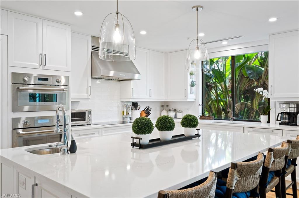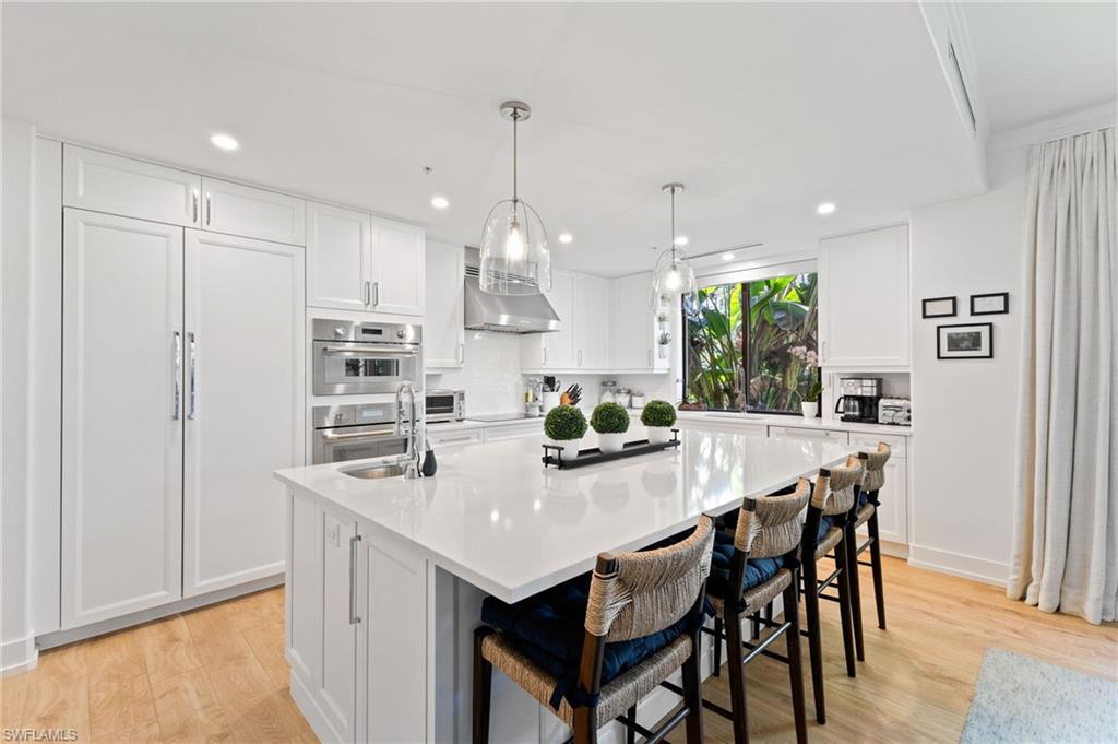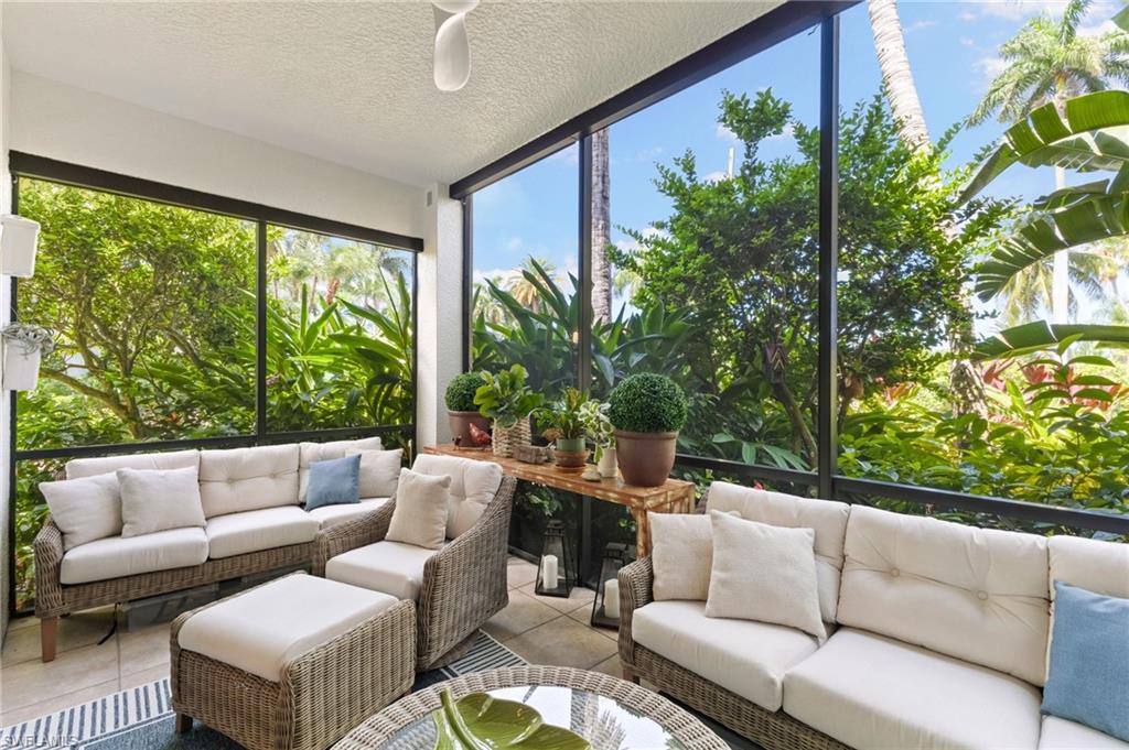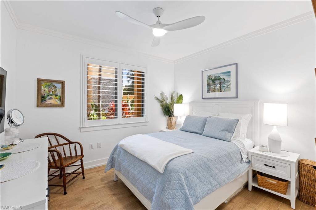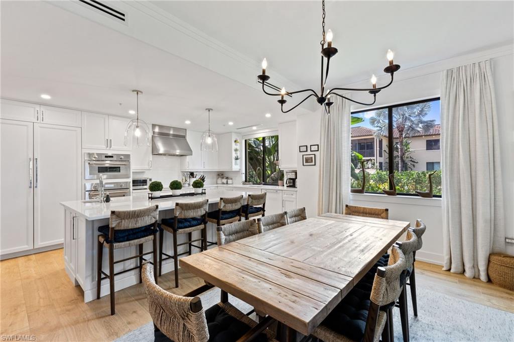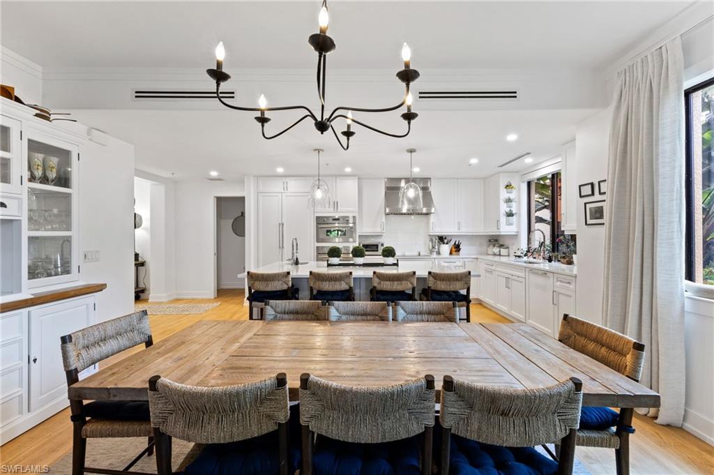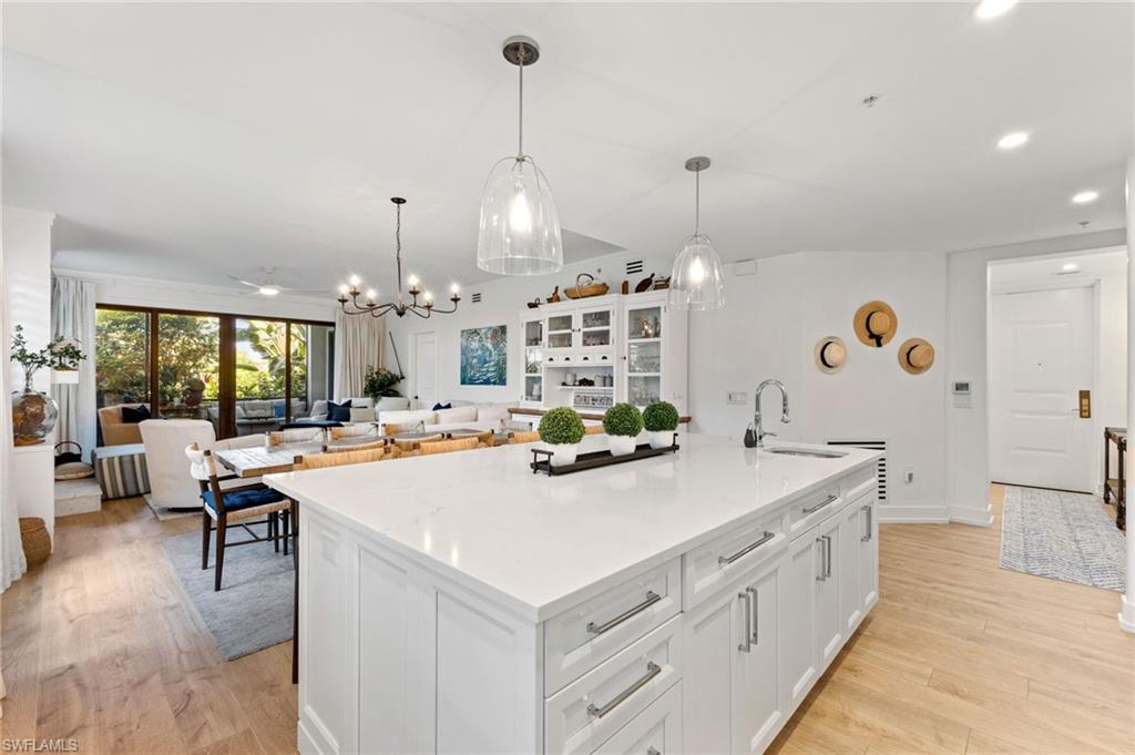 Elegantly appointed and fully renovated first-floor residence at The Cottages at Naples Bay Resort is now available. A corner unit ideally located on the ground floor. Masterfully reimagined, one of only eight true 3 bedroom condominiums in the community, the unit features a reconfigured kitchen with custom cabinetry, sleek counters, stylish fixtures, Thermador appliances, and a spacious center island with a prep sink and beverage refrigerator. Authentic wood featured porcelain tile flooring, crown molding, custom cabinetry, and a built-in fireplace complete the spacious living room. An oversized primary suite features two walk-in closets and an ensuite bath with a dual vanity, separate soaking tub and steam shower. Not to be outdone, the guest bathroom has also been completely upgraded. Motorized shades, plantation shutters, and custom drapery allow for bright southern sunlight during the day and privacy at night. Updated light fixtures, a tankless water heater, complete HVAC system, washer/dryer, and fan provide long-term comfort and convenience.