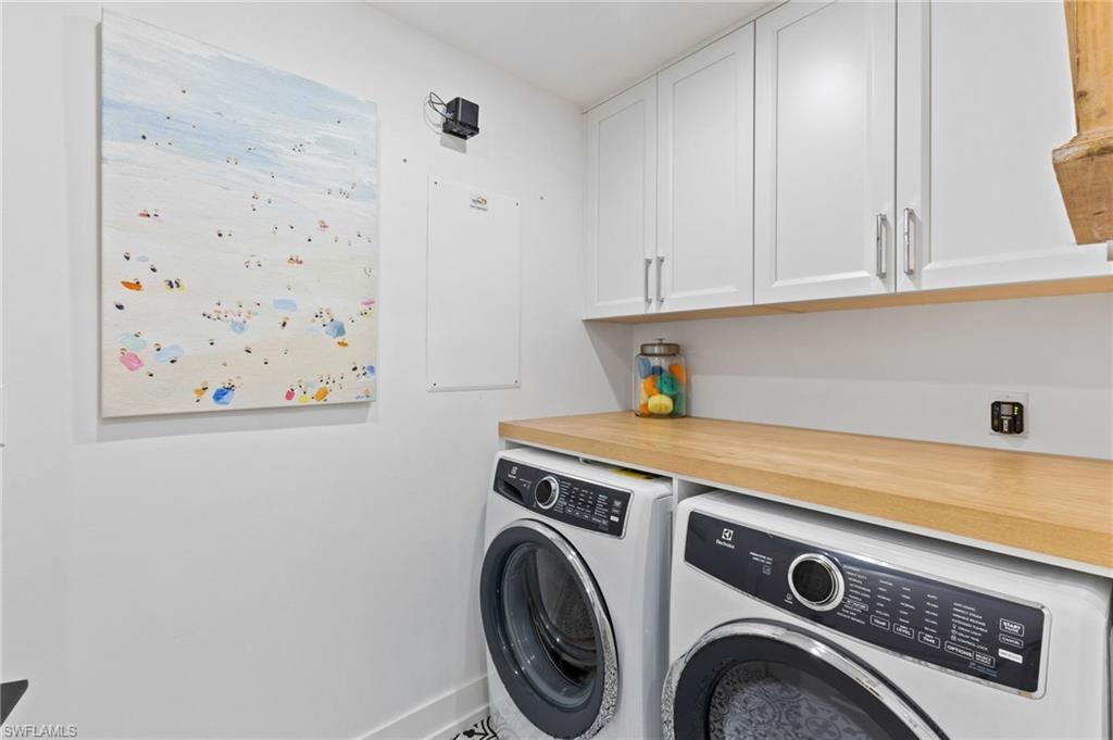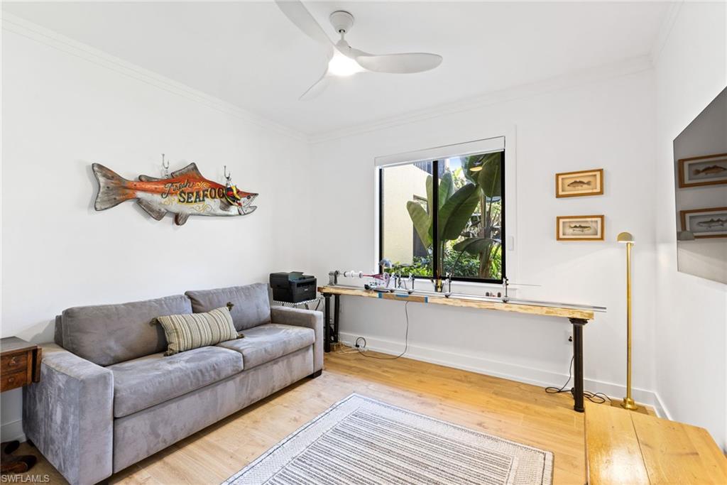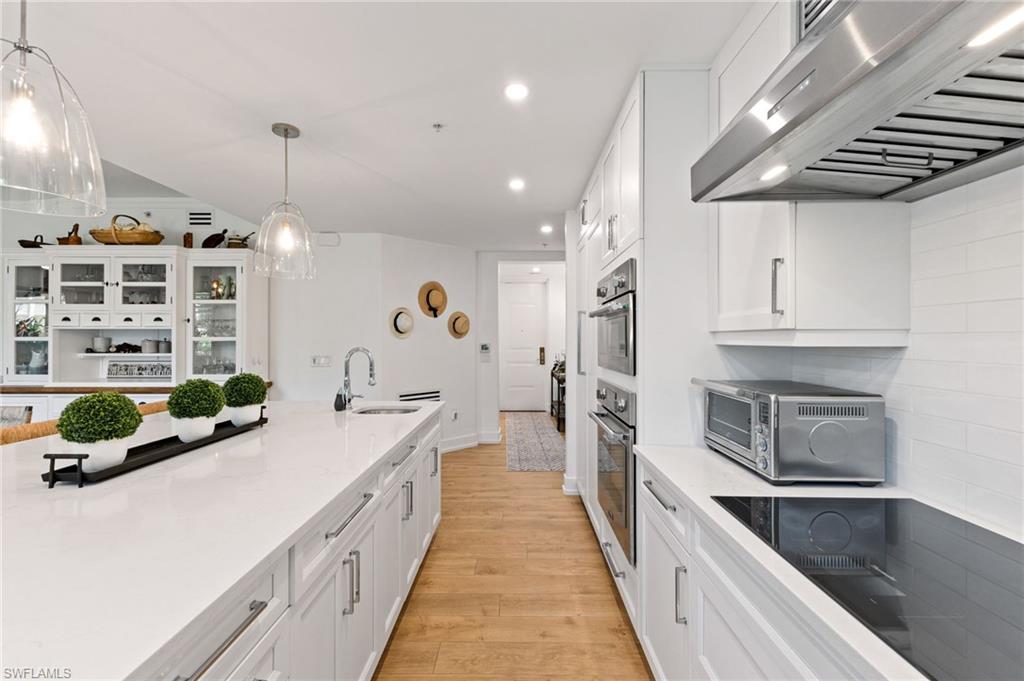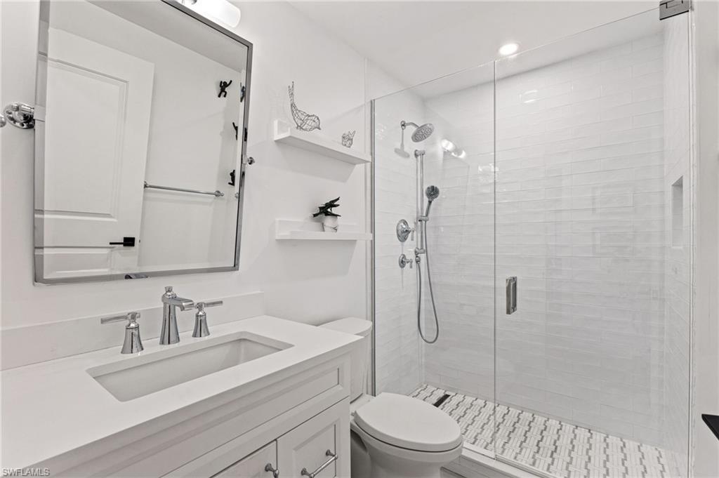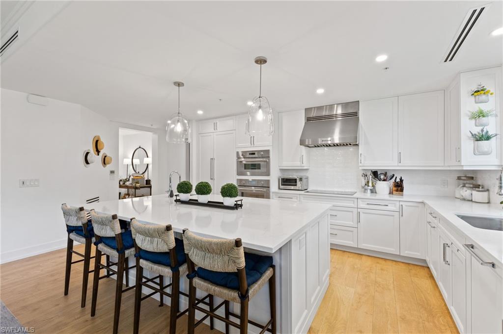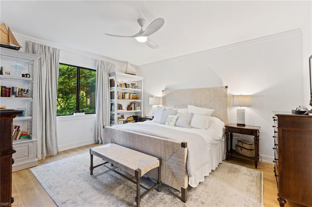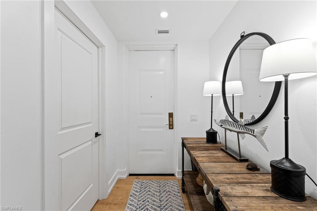 Elegantly appointed and fully renovated first-floor residence at The Cottages at Naples Bay Resort is now available. A corner unit ideally located on the ground floor. Masterfully reimagined, one of only eight true 3 bedroom condominiums in the community, the unit features a reconfigured kitchen with custom cabinetry, sleek counters, stylish fixtures, Thermador appliances, and a spacious center island with a prep sink and beverage refrigerator. Authentic wood featured porcelain tile flooring, crown molding, custom cabinetry, and a built-in fireplace complete the spacious living room. An oversized primary suite features two walk-in closets and an ensuite bath with a dual vanity, separate soaking tub and steam shower. Not to be outdone, the guest bathroom has also been completely upgraded. Motorized shades, plantation shutters, and custom drapery allow for bright southern sunlight during the day and privacy at night. Updated light fixtures, a tankless water heater, complete HVAC system, washer/dryer, and fan provide long-term comfort and convenience.
